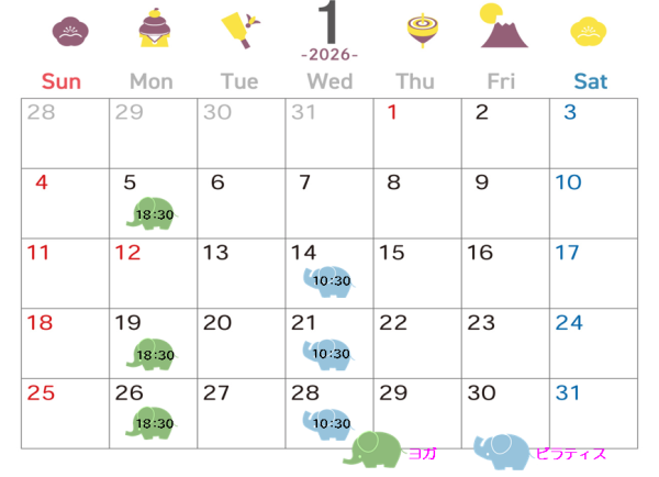 ヨガ・ピラティス 1月開催日のお知らせをいたします。