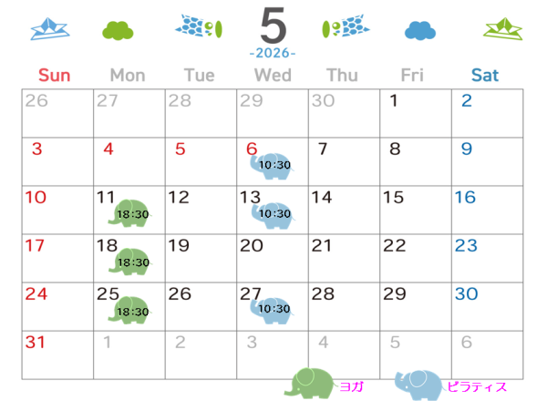 ヨガ・ピラティス 5月開催日のお知らせをいたします。