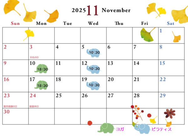 ヨガ・ピラティス 11月開催日のお知らせをいたします。