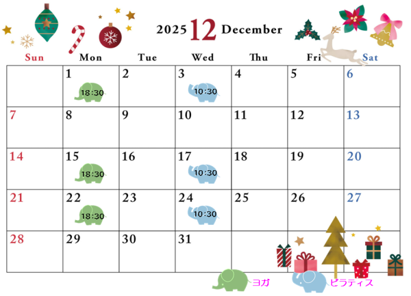 ヨガ・ピラティス 12月開催日のお知らせをいたします。